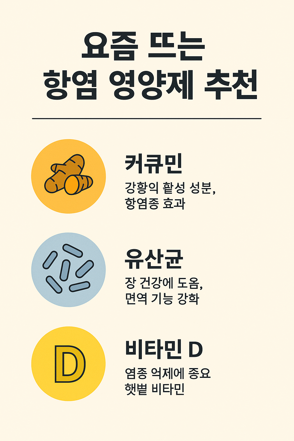 만성염증은 다양한 질병의 근본 원인으로 주목받으면서, 염증을 낮추기 위한 건강기능식품에 대한 관심이 급격히 높아지고 있습니다. 특히 커큐민, 유산균, 비타민D는 과학적 연구를 통해 항염 효과가 검증되면서 건강 전문가와 소비자 모두에게 필수 영양소로 인정받고 있습니다. 최근에는 생활습관병 예방 차원에서 이들 성분을 일상적으로 보충하는 트렌드도 확산되고 있습니다. 이번 글에서는 이 세 가지 핵심 항염 성분이 우리 몸에 어떤 작용을 하고, 올바른 복용법은 무엇인지 구체적으로 알아보겠습니다.